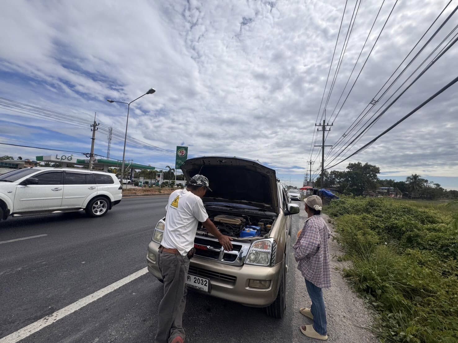 ระหว่างปฏิบัติหน้าที่ได้พบ ประชาชนขอความช่วยเหลือรถสตาร์ทไม่ติดอยู่บริเวณตรงข้ามปั๊ม พีที