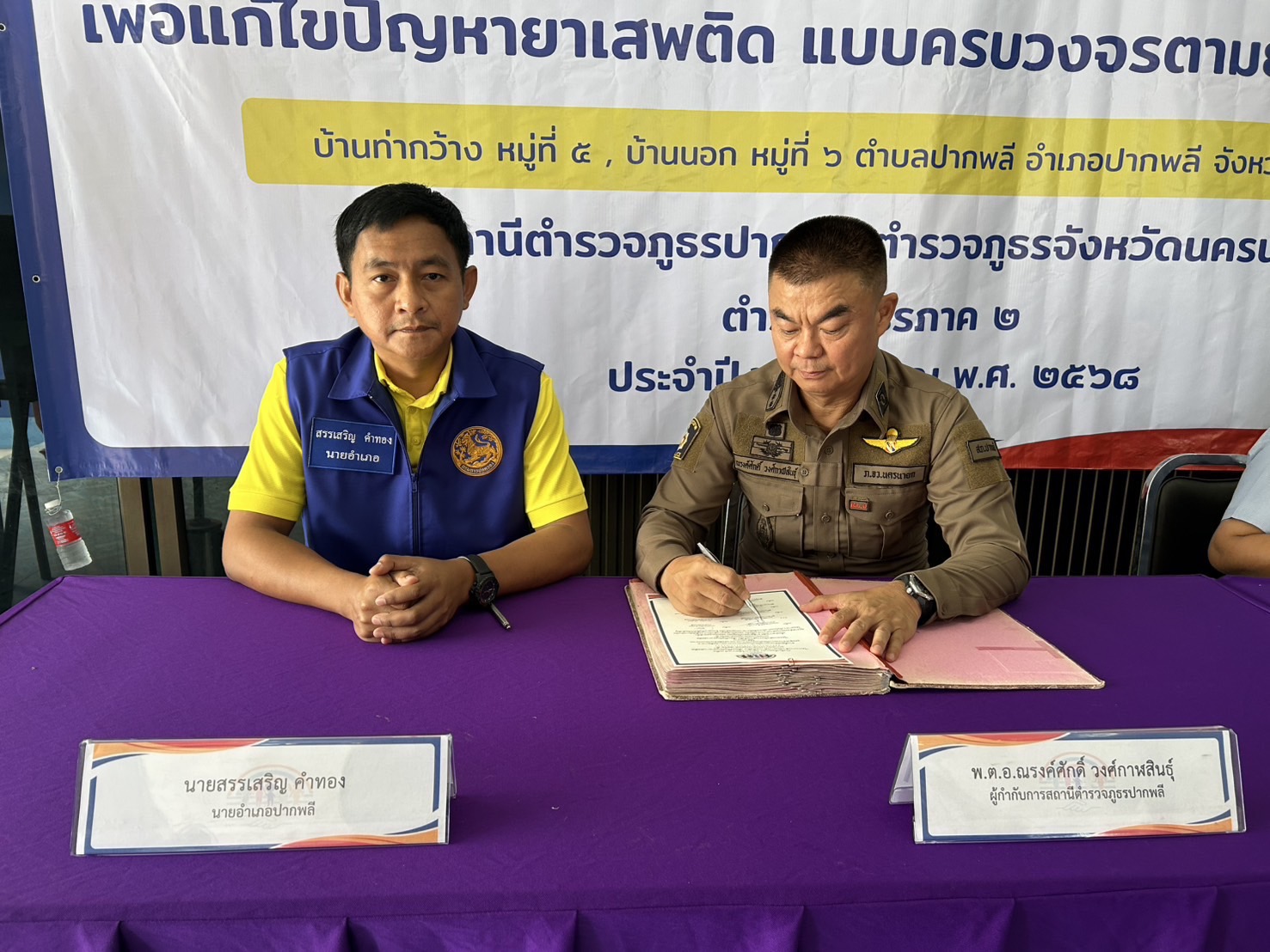 พร้อมชุด ปฏิบัติการ ฯ ภาคีเครือข่ายในพื้นที่ และประชาชนบ้านท่ากว้าง หมู่ที่ 5 และ บ้านนอก หมู่ที่ 6 ต.ปากพลี อ.ปากพลี จ.นครนายก ให้การต้อนรับ พร้อมกันนี้ได้มีการร่วมลงนาม MOU โดยหัวหน้าส่วนราชการและผู้นำชุมชนภาคีเครือข่ายในพื้นที่ประกอบด้วย
